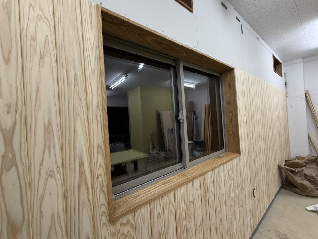 切り取った壁の部分仕上げ用の板で覆う、そして壁にも化粧板を貼る。おしゃれ感がグッとアップしました。あわせて木のいい香りが漂い癒される空間になりました。