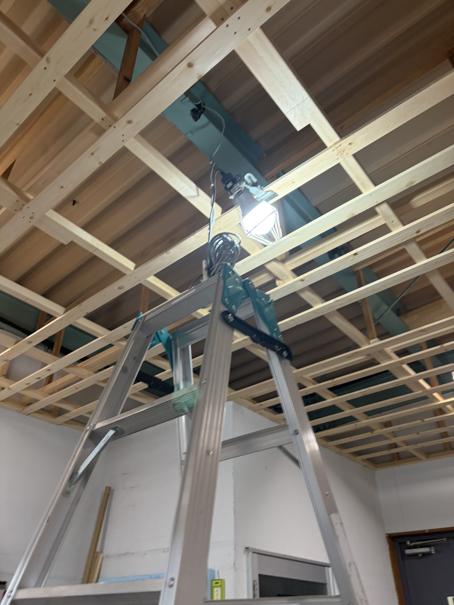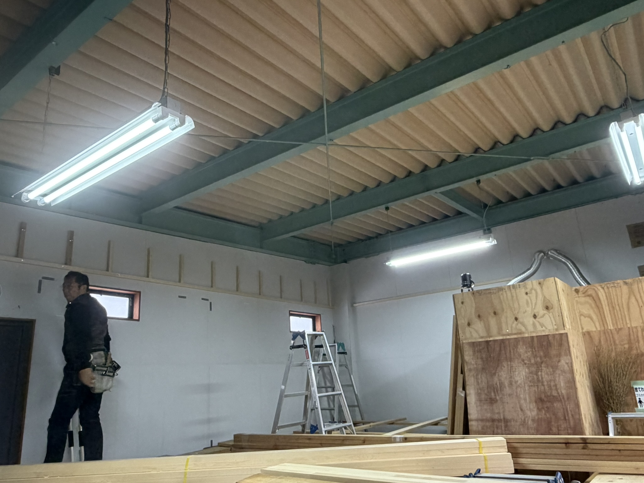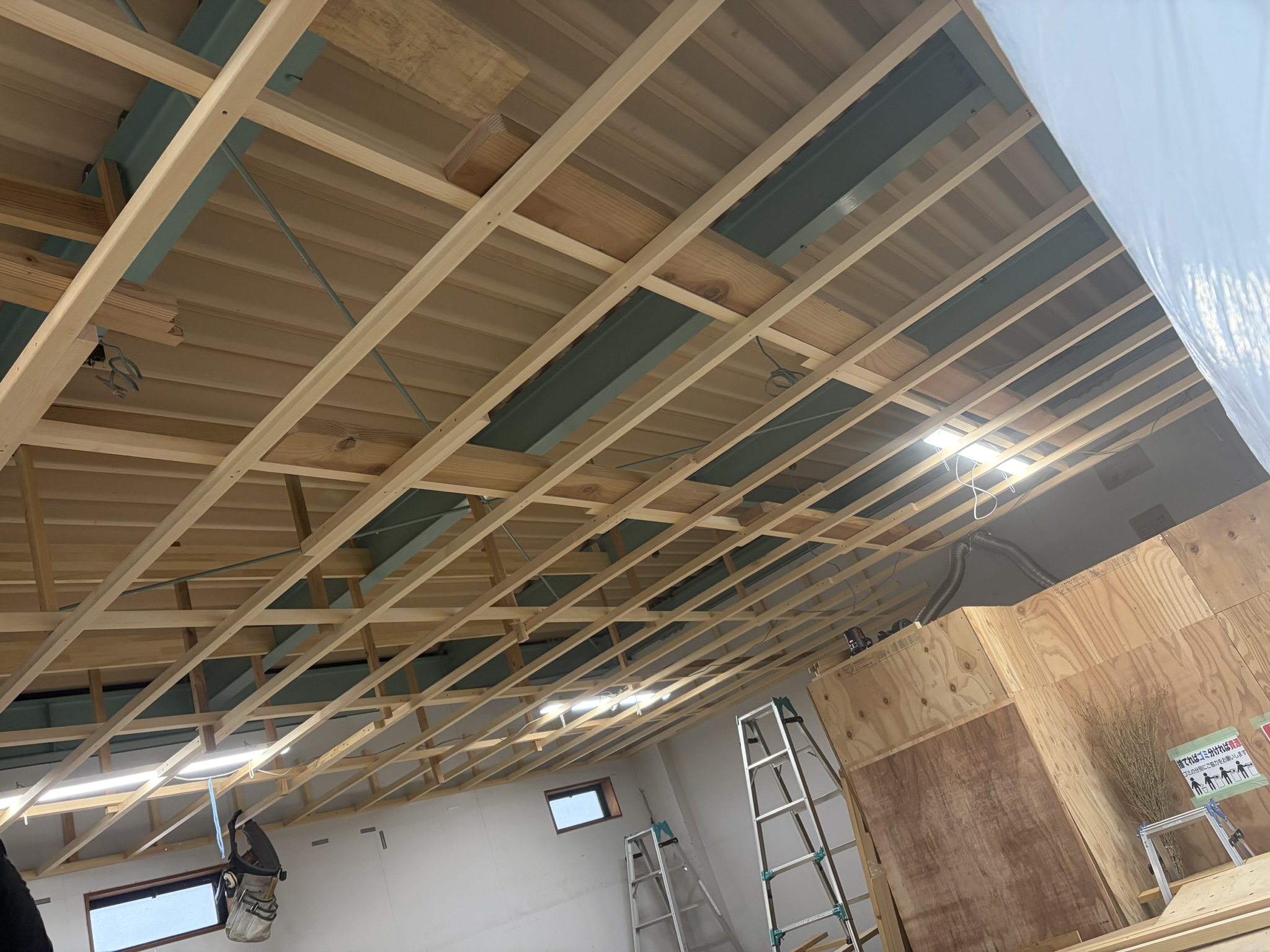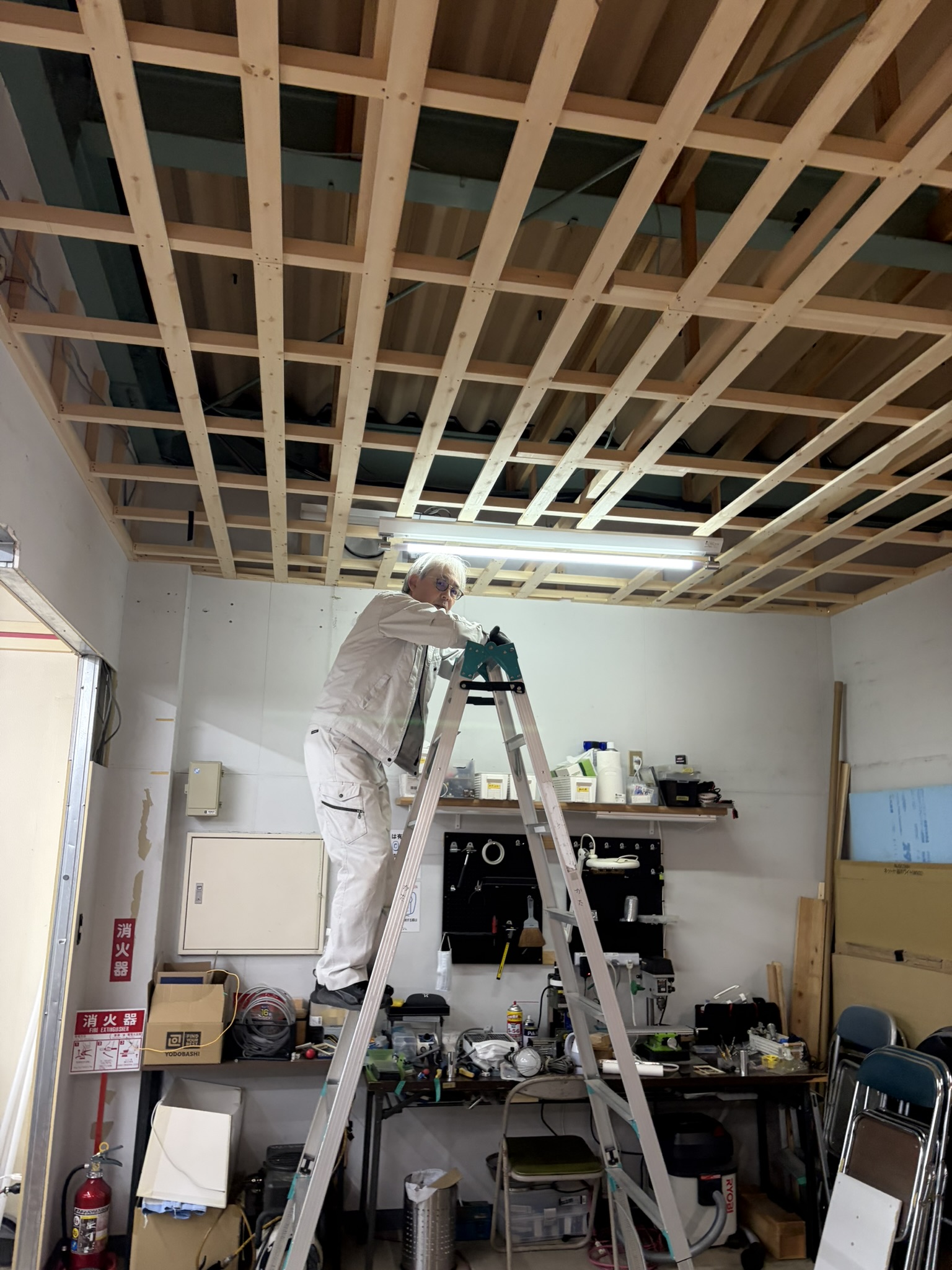まずは天井を張るための骨組み作りです。作業のための足場が脚立と板で手際よく出来上がりました。その足場の上を軽やかにステップしながら作業は進みます。