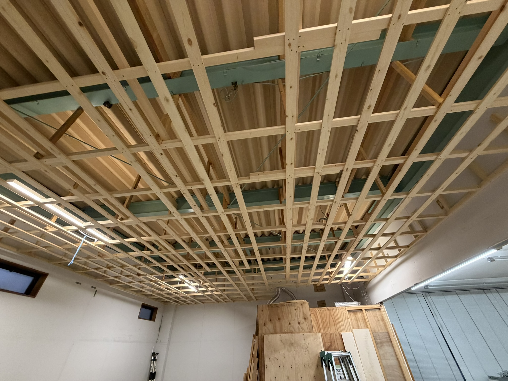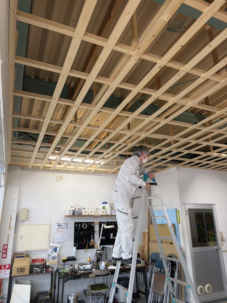 みるみる天井板を張るための骨組みができあがっていきます。