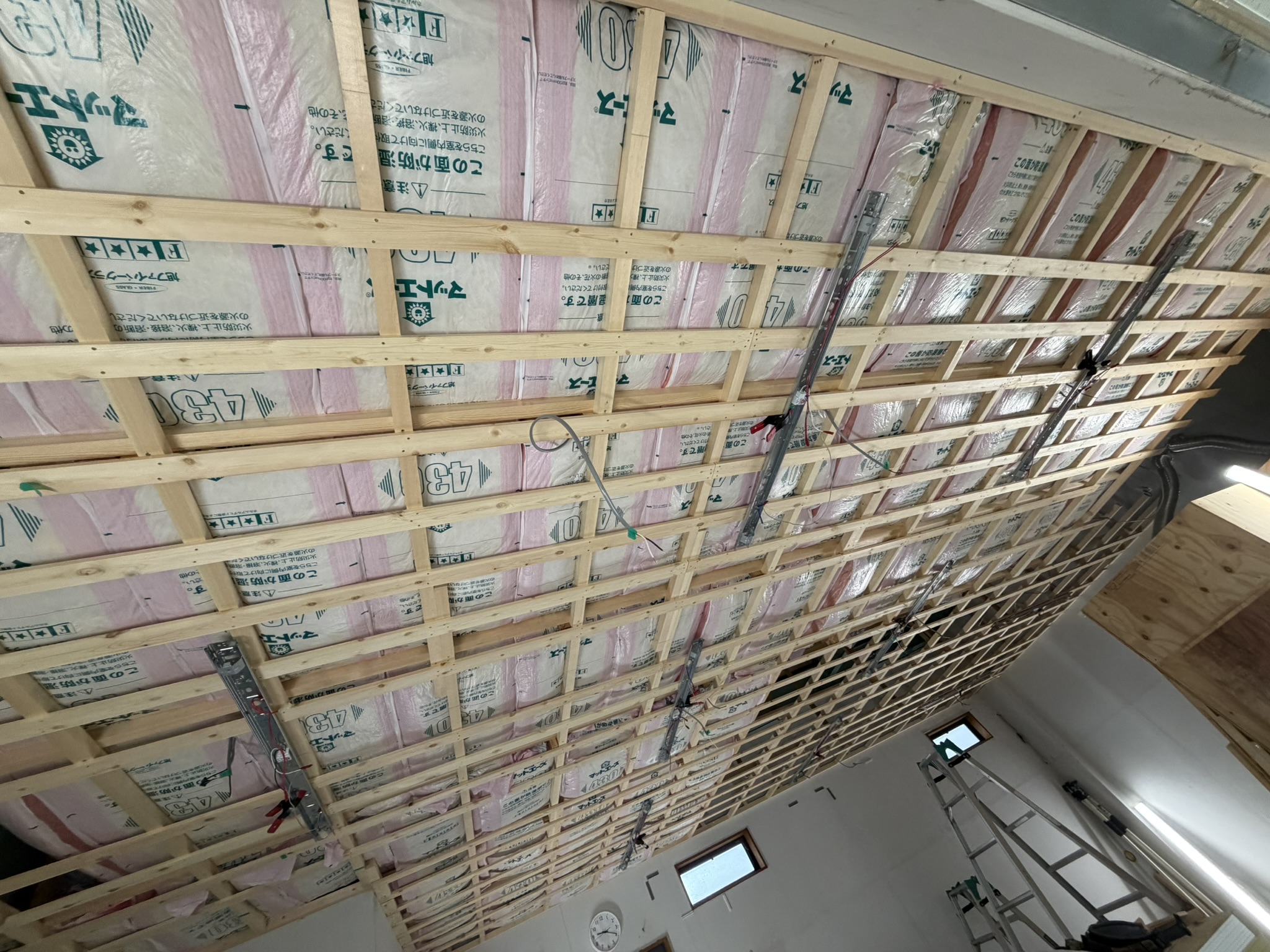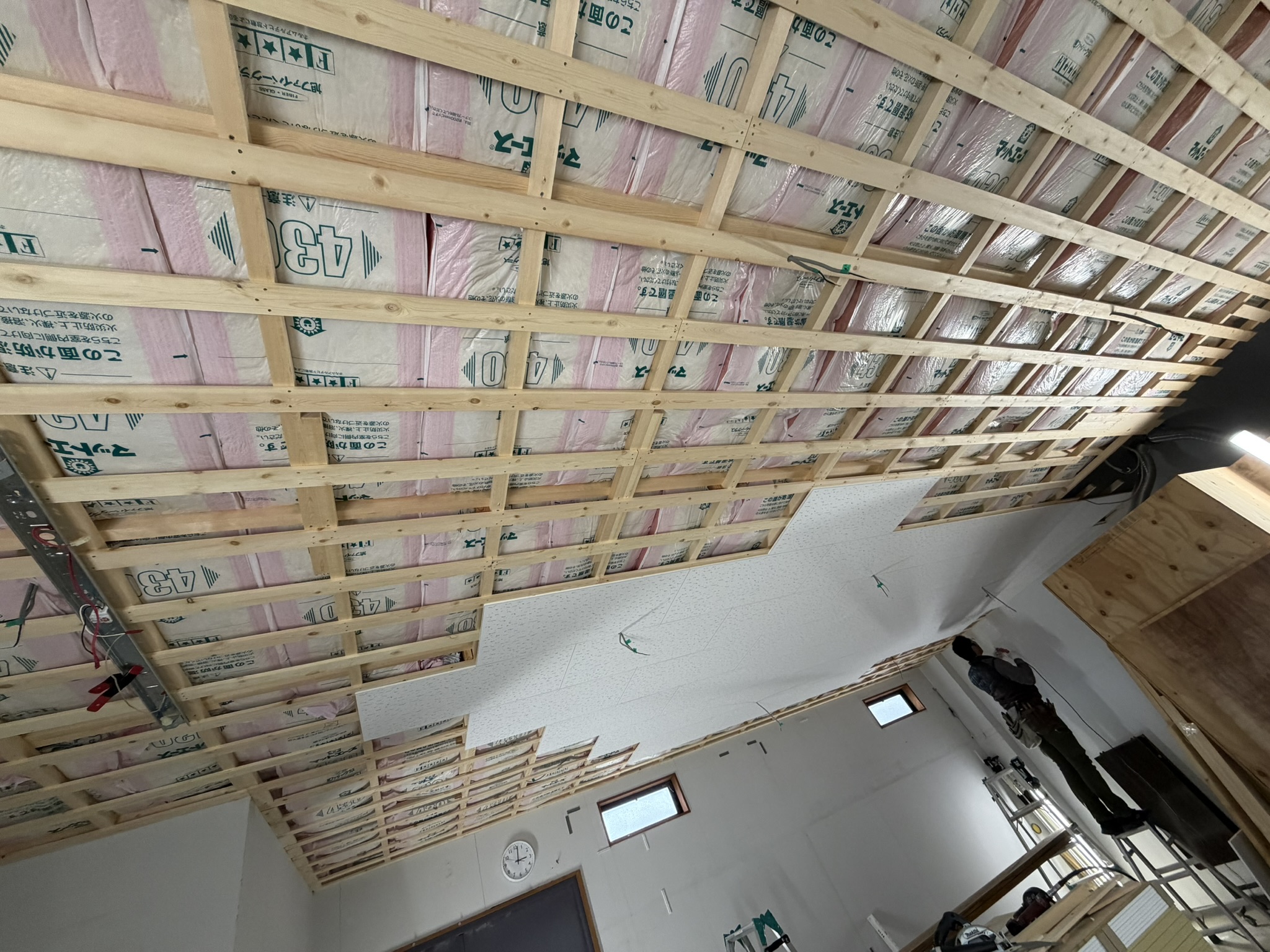 配線が完成したところで、断熱剤をいれて、天井板を貼る。