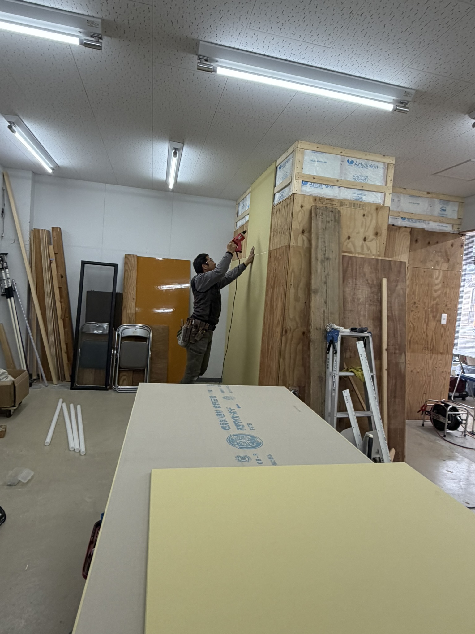 最初の一歩は天井の高さに合わせて、壁の周囲に「野縁受け(下地)」と呼ばれる天井板を貼るための下地を組んでいきます。