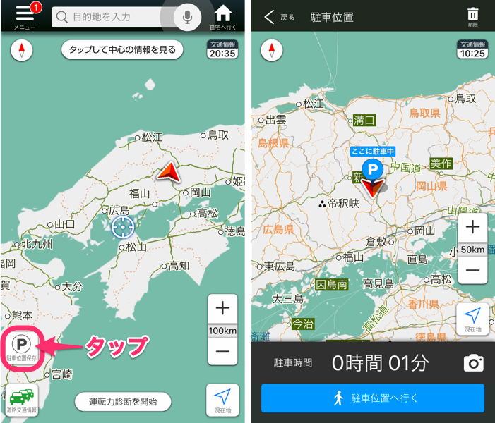 駐車場に車を停めて、[駐車場位置保存]ボタンをタップすると、駐車場位置を教えてくれます。