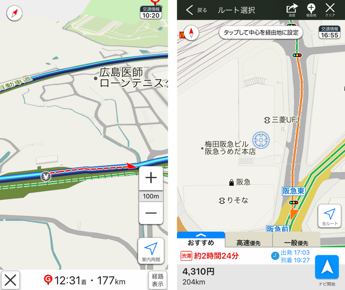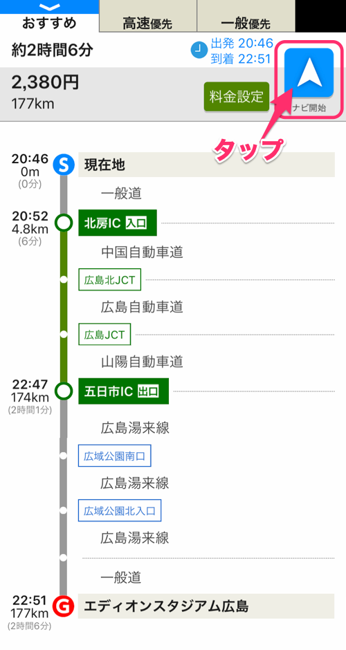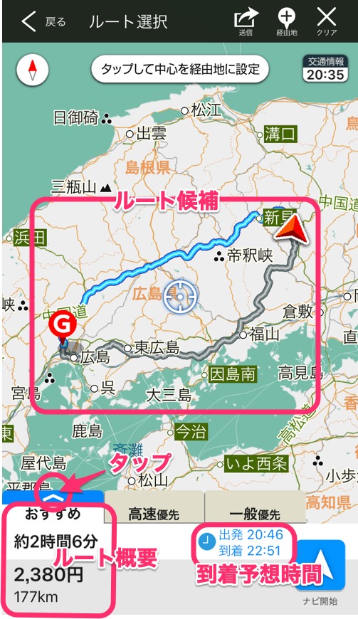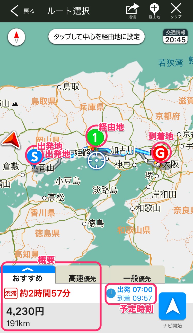 ルートの概要が表示されます(所用時間、高速代などの利用料金、距離など)