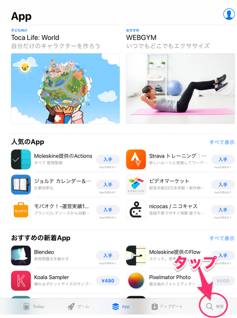 右下の[検索アイコン(虫眼鏡マーク)]をタップします。