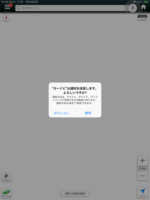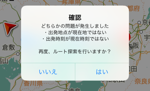 以下の場合はナビを実施することができないため、[ナビ開始]ボタンをタップしても以下のメッセージが表示されて、ナビ画面になりません。