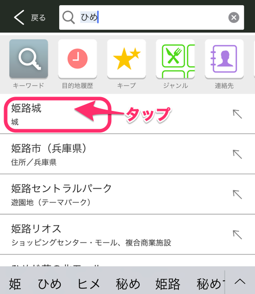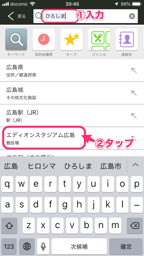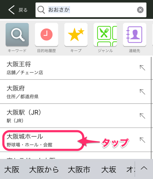 *目的地は、地名や施設名などで検索できます。また入力内容を全ていれなくても、ある程度入力すると、候補一覧が表示されます。