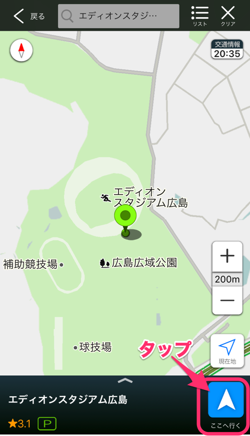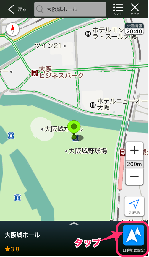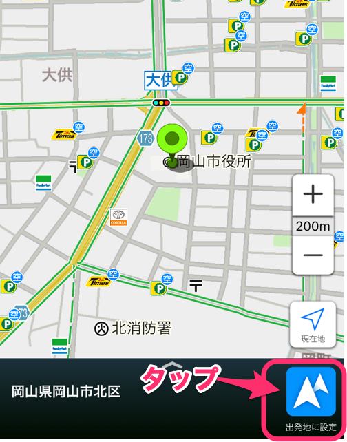 目的地点の地図が表示されます、[目的地に設定]のボタンをタップします。