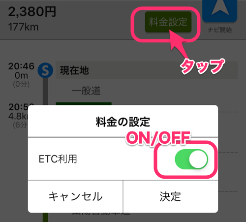 ナビ開始ボタンの左にある[料金設定]ボタンをタップすると、高速道路の料金設定でETCを利用するか否かが選択できます。ONにするとETC利用時の利用料金が反映されます(休日割引や夜間割引も適用されます)
