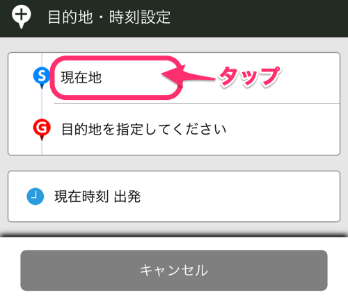 出発地の設定:[S] の欄、現在地と入力している欄をタップします