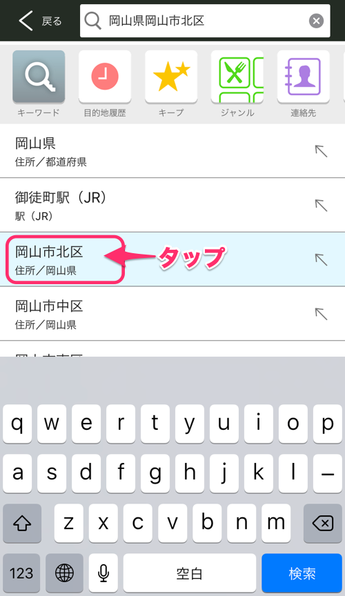 同様の操作で、経由地点の地名または施設名を検索欄に入力します、
