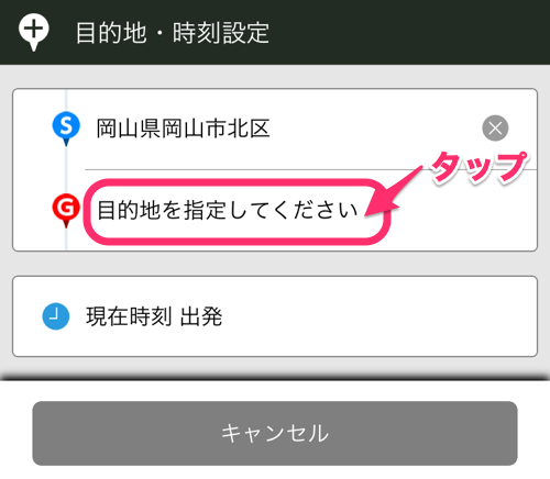 目的地の設定:[G] の欄、「目的地を指定してください」と入力している欄をタップします