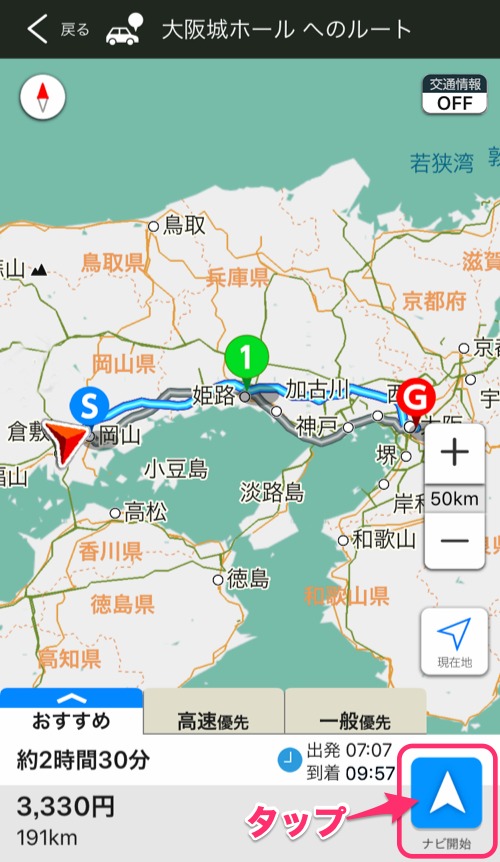 確認後、このルートで問題なければ[ナビ開始]ボタンをタップします。