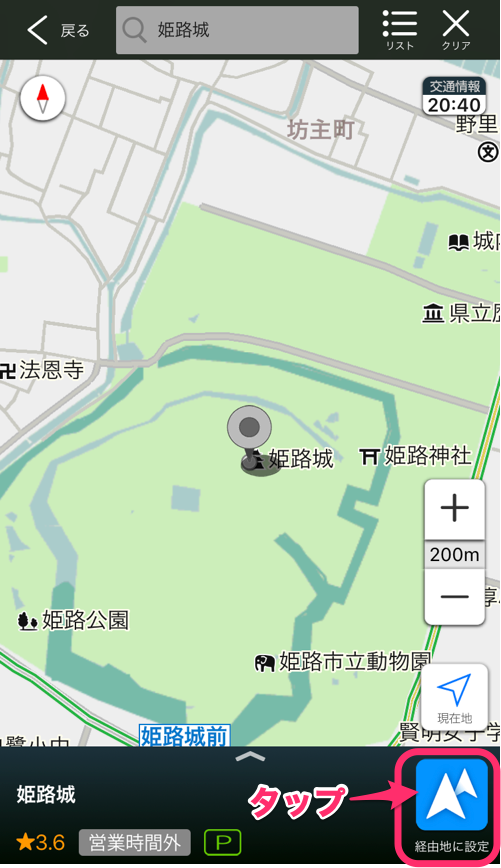 経由地点の地図が表示されます、[経由地に設定]のボタンをタップします。