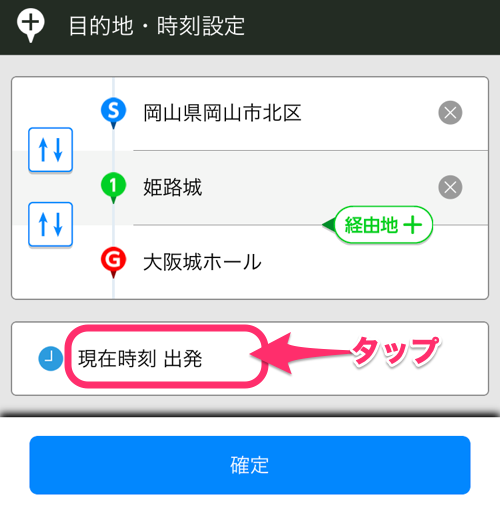 時計アイコンの欄 [現在時刻 出発]の文字をタップします