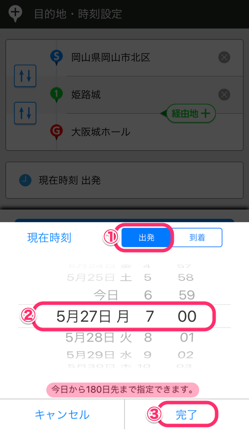 ①出発時刻を設定するのか、到着時刻を設定するのかを選びます