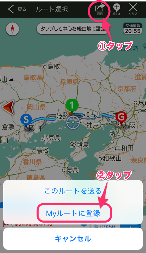 ①ルート選択画面で、画面上部の[送信]マークのボタンをタップします。
