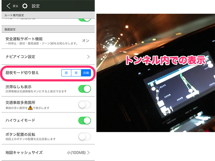 夜間や、トンネル内に入ると画面が夜間モードに切り替わる設定です。以下から選択します。