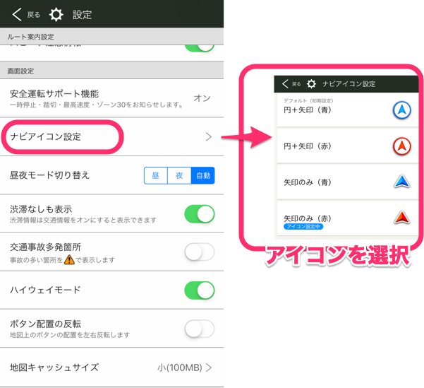 地図上、またはナビ中に自分の車を示すアイコンになります。好みで選択します。