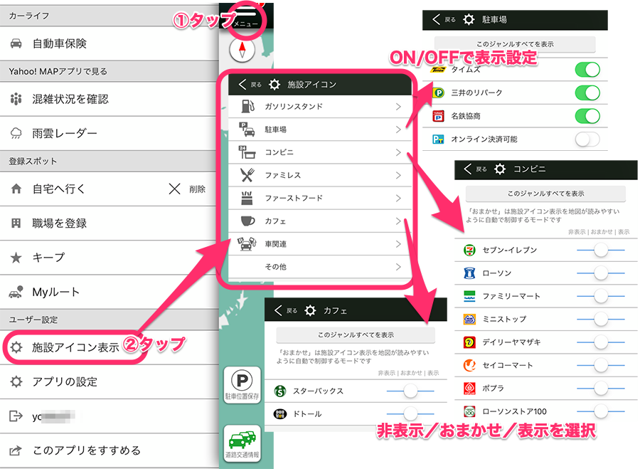 施設アイコンをタップして、各々の施設の表示or非表示を設定します。