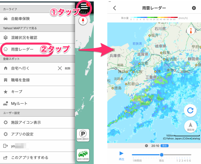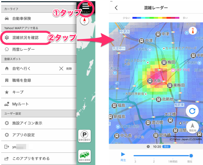 Yahoo!MAPアプリと連携して、詳細な混雑状況や、雨雲レーダーの情報が確認できます。