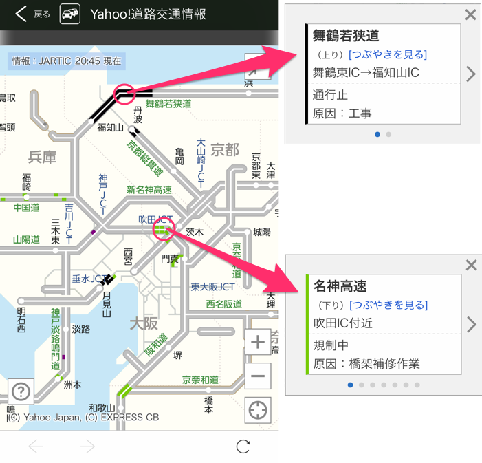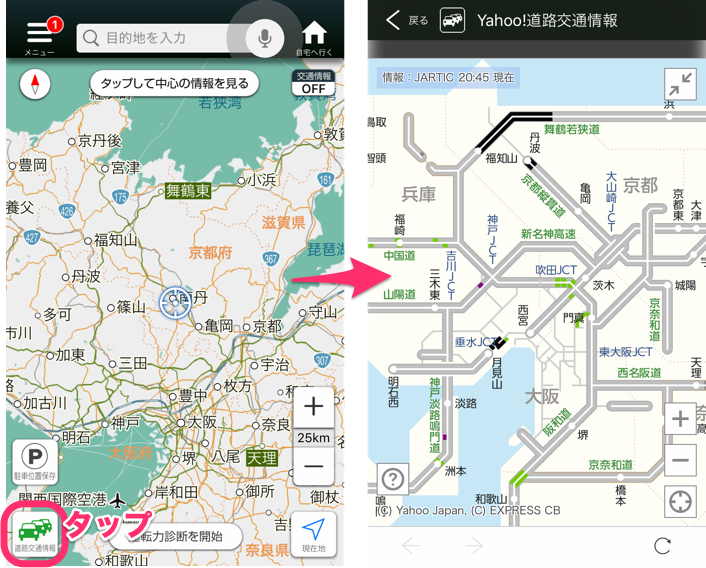 左下の[道路交通情報]をタップします、[Yahoo!道路交通情報]の画面が表示されます。