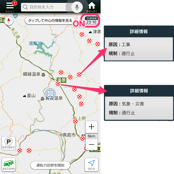 マークをタップすると、通行止めの原因や規制の内容が表示されます。