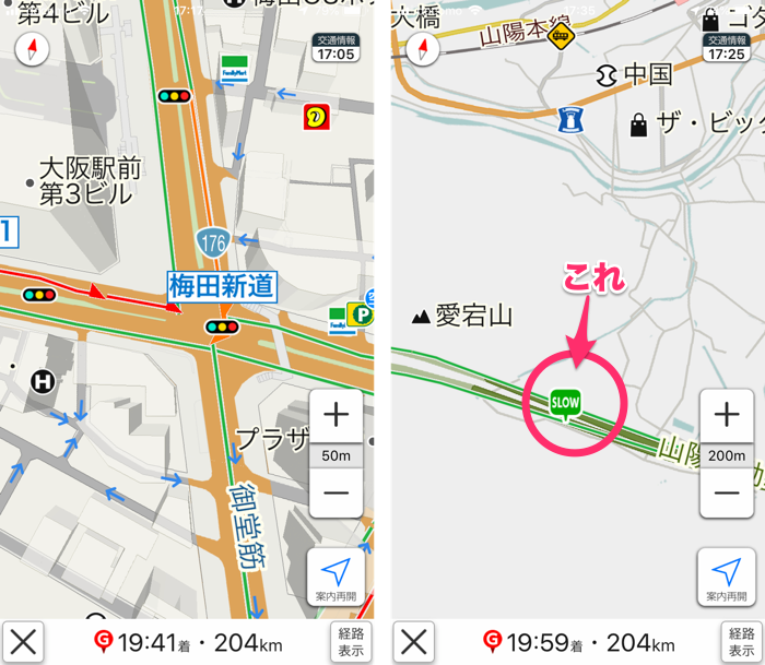 また、速度取り締まり機等が配置されている場所には、「SLOW」アイコンが表示されます。