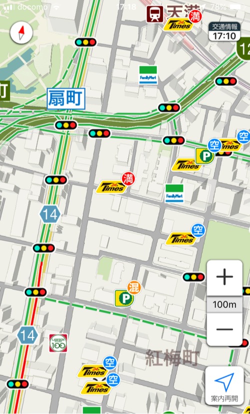 Yahoo!カーナビを利用しているユーザーの走行データを集めて、Yahoo!独自の渋滞情報を表示してくれます。空いている道は緑、混んでいる道はオレンジ、渋滞の道は赤の「実線」で表示されます。