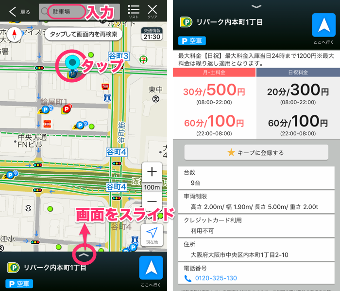 さらに、その画面を上に向かってスライドすると詳駐車場の詳細な情報が表示されます。